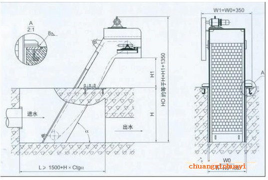 電機、減速機驅動機構安裝在機架上部的左側或右側,減速機輸出軸上的鏈輪,通過鏈輪帶動鏈耙牽引機構的主動鏈輪旋轉,從動鏈輪的作用是張緊耙鏈安裝機架尾部,由安裝齒耙的鏈條牽引回轉,從而帶動安裝在兩牽引鏈條之間的齒耙一起回轉,每個耙齒都插在柵條縫隙內,將攔截的污物耙送到機架上部極限位置時,齒耙隨鏈條換向而翻轉,齒耙上的污物自動落入垃圾小車或其它輸送設施上運走。同時另設的一對膠板刷對每排經過這里的齒耙作清污工作,至此,完成一個清污的循環(huán)工作。