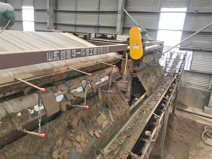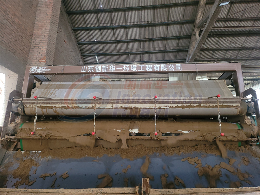 物料加入改性劑對(duì)物料進(jìn)行改性后(部分污泥還需加入三氯化鐵),再進(jìn)入布漿器均勻地分布在重力脫水區(qū),物料在該區(qū)域內(nèi)主要靠自身的重力作用脫去部分水份,然后物料進(jìn)入預(yù)壓脫水區(qū),在兩條網(wǎng)帶及呈“S”型分布輥的擠壓下,漿料所受壓力逐漸提高,脫去物料間的部分水份,然后漿料進(jìn)入由液壓站提供動(dòng)力,橡膠帶為受力裝置的高壓擠壓區(qū),進(jìn)一步擠壓處于兩網(wǎng)之間的物料,脫去物料中的水分,然后達(dá)到一定干度的物料形成餅狀,再由刮刀刮落。卸去漿料的濾網(wǎng)經(jīng)高壓水沖滌干凈后進(jìn)入下一個(gè)工作循環(huán)。