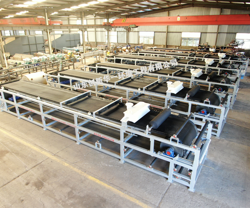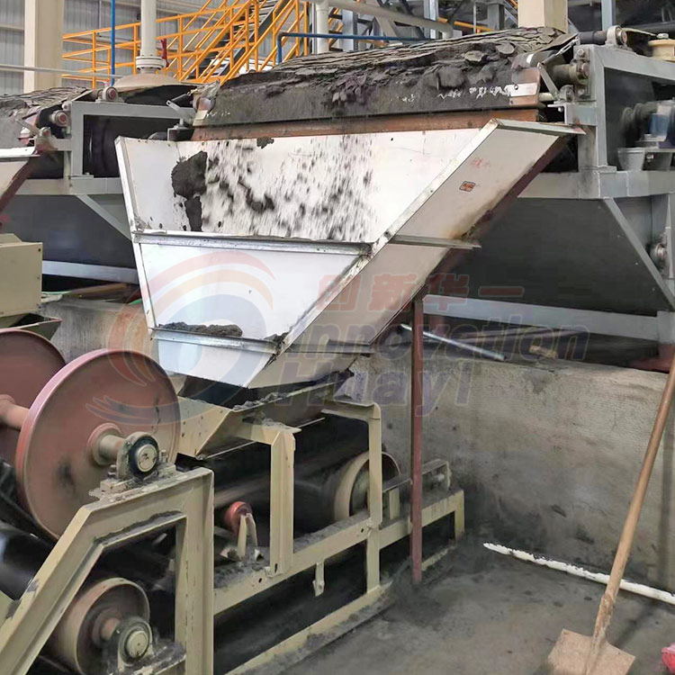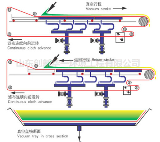 尾礦帶式真空過(guò)濾機(jī)采用了固定真空盒,膠帶在真空盒上滑動(dòng),真空盒與膠帶間構(gòu)成運(yùn)動(dòng)密封的結(jié)構(gòu)型式,以真空負(fù)壓為推動(dòng)動(dòng)力實(shí)現(xiàn)固液分離的設(shè)備。在結(jié)構(gòu)上,過(guò)濾區(qū)段沿水平長(zhǎng)度方向布置,能連續(xù)自動(dòng)完成過(guò)濾、濾餅洗滌、卸 渣、濾布再生等工藝操作,并且母液有與濾餅洗滌洗液可以分段收集。具有過(guò)濾效率高、生產(chǎn)能力大、洗滌效率好,濾餅水分低、操作靈活、維護(hù)簡(jiǎn)單等優(yōu)點(diǎn)。